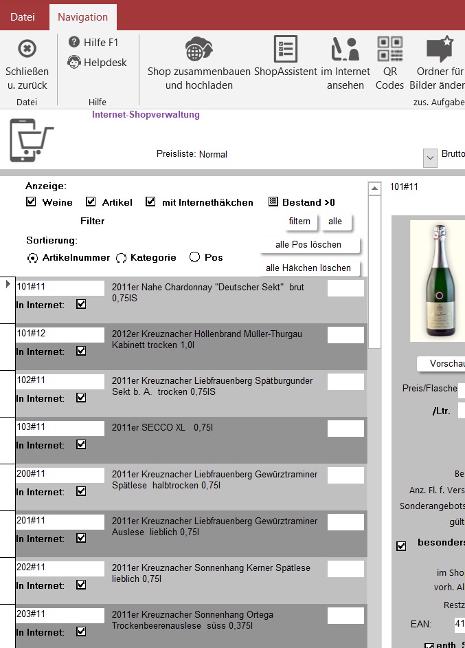 Im obigen Beispiel werden also alle Weine und Artikel angezeigt, die bereits ein Häkchen bei IN Internet haben. Der Bestand spielt dabei keine Rolle.