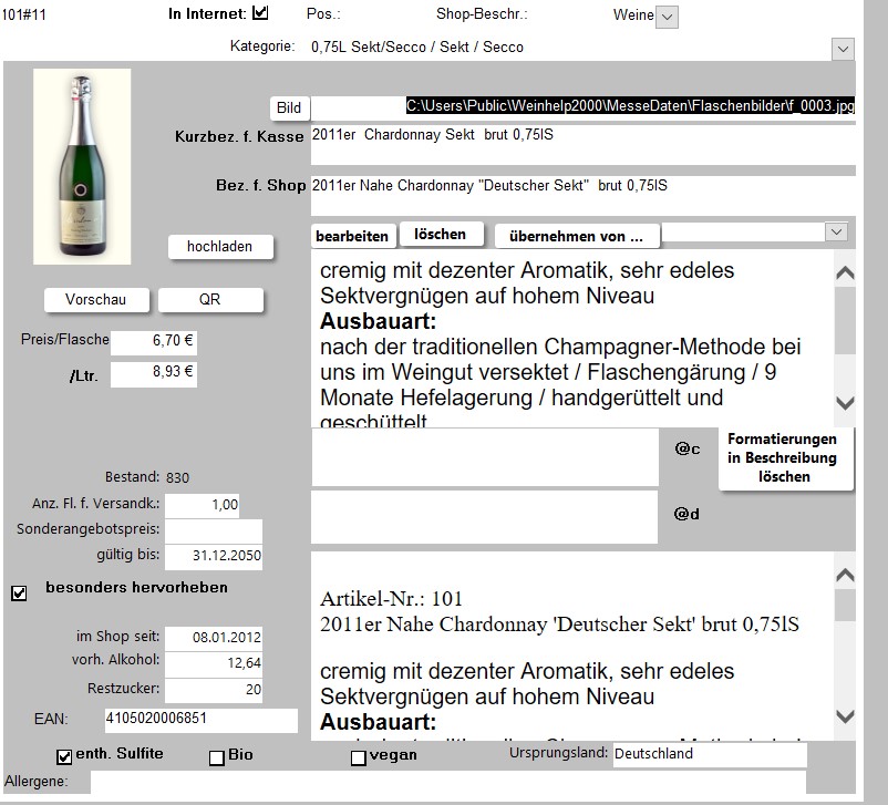 Bez. f. SHOP hier können sie eine abweichende Bezeichnung für den Wein eingeben. Z. Bsp. wenn die Bezeichnung für die Rechnung zu lang ist für den SHOP oder einfach im SHOP eine Kurzbezeichnung stehen soll.