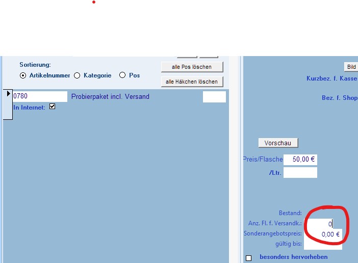 Im Feld Anz. Fl. f. Versandk. werden die Anzahl Flaschen für die Versandkostenberechnung eingegeben. Normalerweise steht da entweder nichts, oder eine 1. Wenn sie z. Bsp. ein 6er-Paket als Einheit verkaufen möchten, tragen Sie hier eine 6 ein. Dann berechnet der SHOP im Warenkorb für das Paket dann 6 Flaschen. Für versandkostenfreie Artikel tragen Sie hier eine 0 ein. Dann wird der Artikel nicht bei den Versandkosten berücksichtigt.