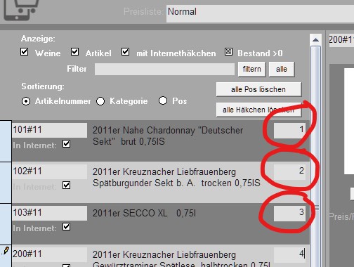 Wenn Sie bei einigen Weinen nichts eintragen, kommen die VOR den Weinen, die eine Nummer haben.