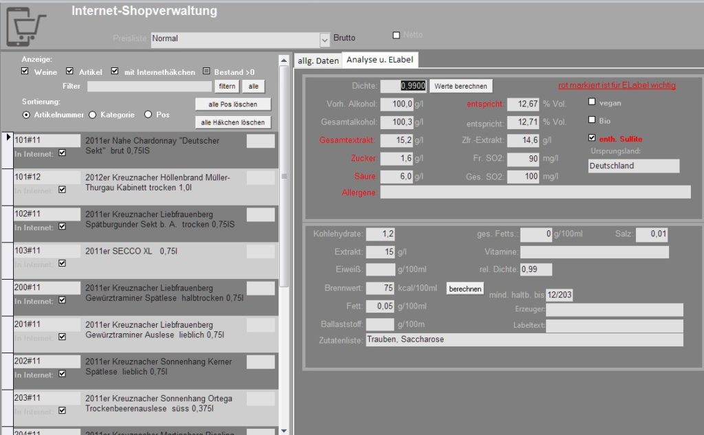 Hier werden die wichtigen Daten für Ihr Internet-Shopsystem eingegeben bzw. bearbeitet. Beachten Sie, dass jeder Wein/Artikel, der ins Internet soll, auch einer Kategorie zugeordnet werden muss.