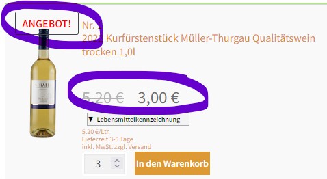 Im Feld Sonderangebotspreis geben sie den Preis ein, der als Sonderangebot für einen Wein zeitlich begrenzt gelten soll. Tragen Sie dann im Feld Gülti bis. das Enddatum ein, an dem der Sonderangebotspreis noch gelten soll.