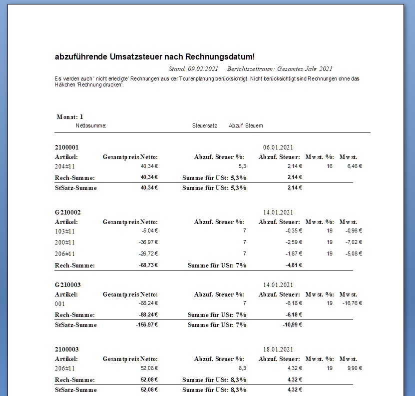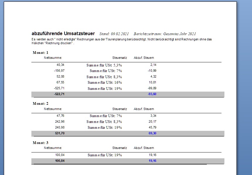 Hier werden die Abzuführenden Steuern angezeigt. Es wird für jede Steuerart jeweils eine Zeile mit den abzuführenden Umsatzsteuern aufgelistet. Es werden auch „nicht erledigte“ Rechnungen aus der Tourenplanung berücksichtigt. Nicht berücksichtigt sind Rechnungen ohne das Häkchen Rechnugn drucken.