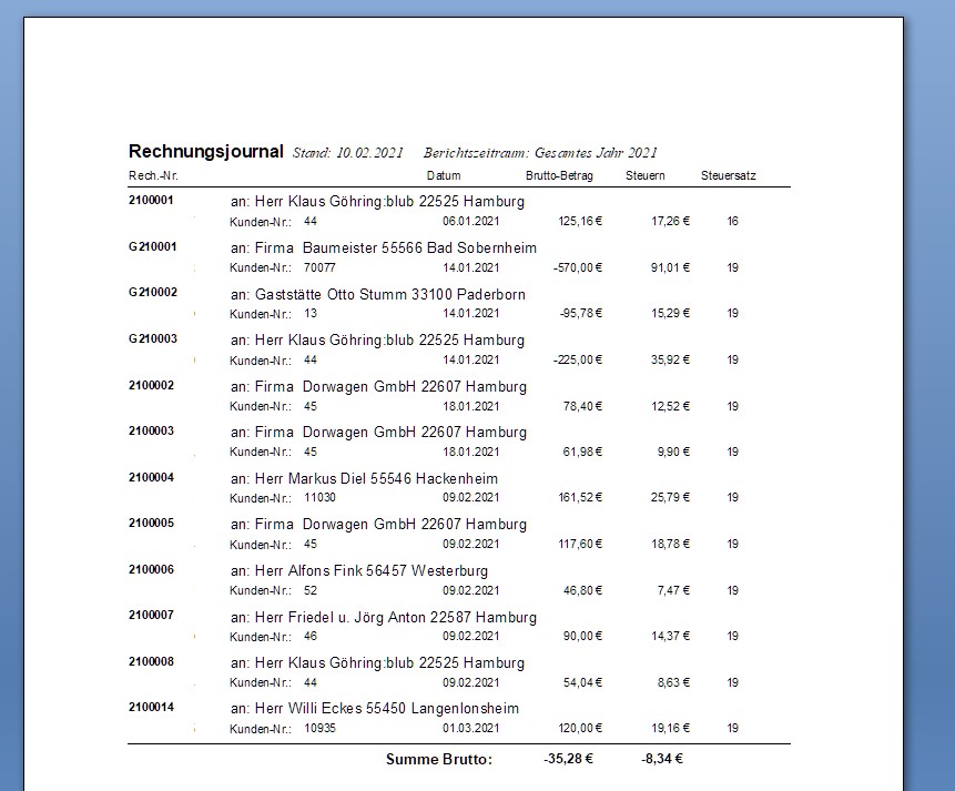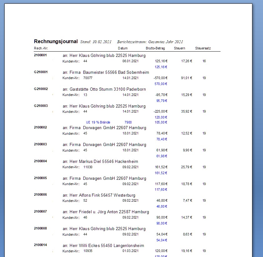 Auflistung aller Rechnungen. Wahlweise nach Rechnungsnummer oder Rechnungsdatum.