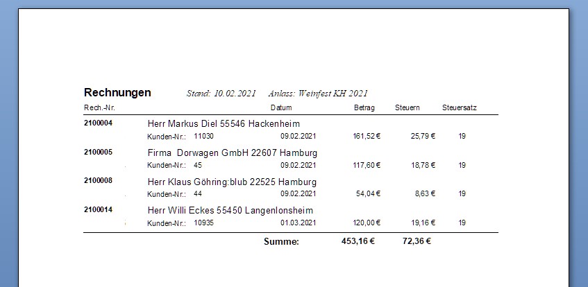 Rechnungsausgangsjournal nach Anlass. Hier werden alle Rechnungen aufgeführt, die zu einem bestimmten Anlass erstellt wurden. Sie können in jeder Rechnung den Anlass eintragen
