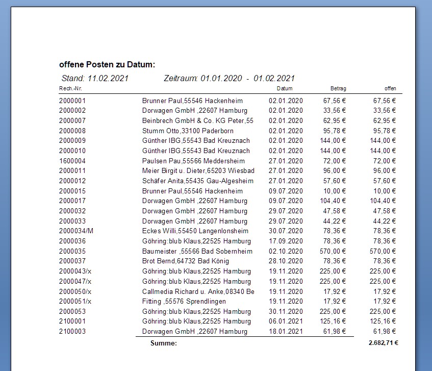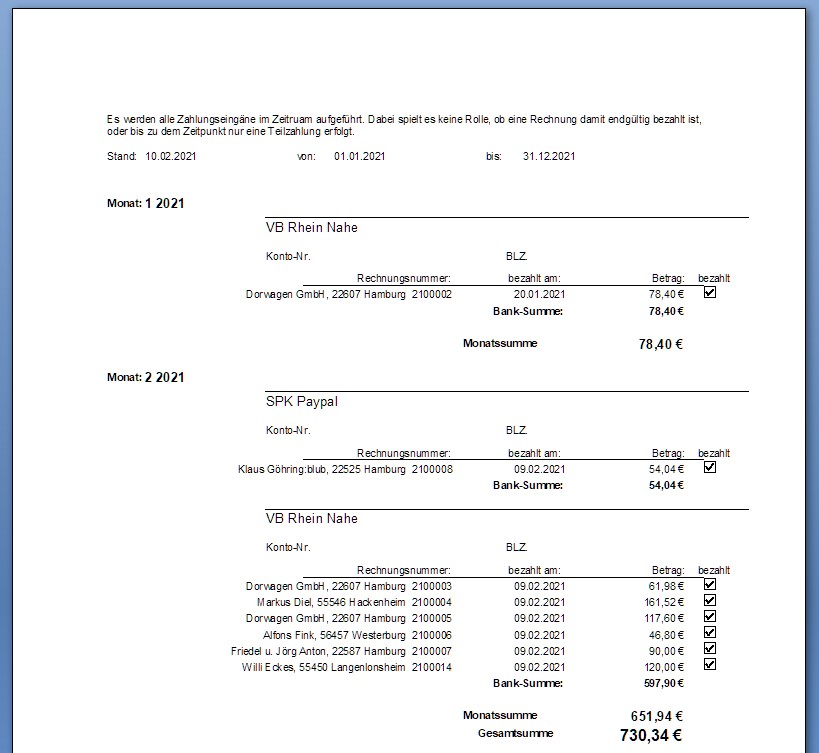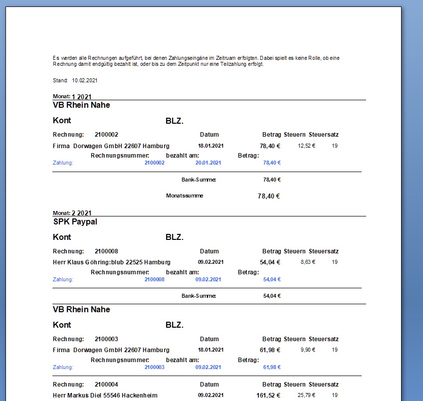 Es werden alle Rechnungen aufgeführt, bei denen Zahlungseingäne im Zeitruam erfolgten. Dabei spielt es keine Rolle, ob eine Rechnung damit endgültig bezahlt ist, oder bis zu dem Zeitpunkt nur eine Teilzahlung erfolgt.