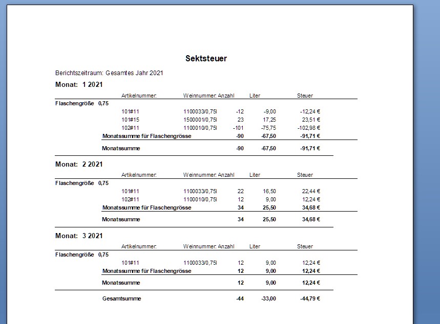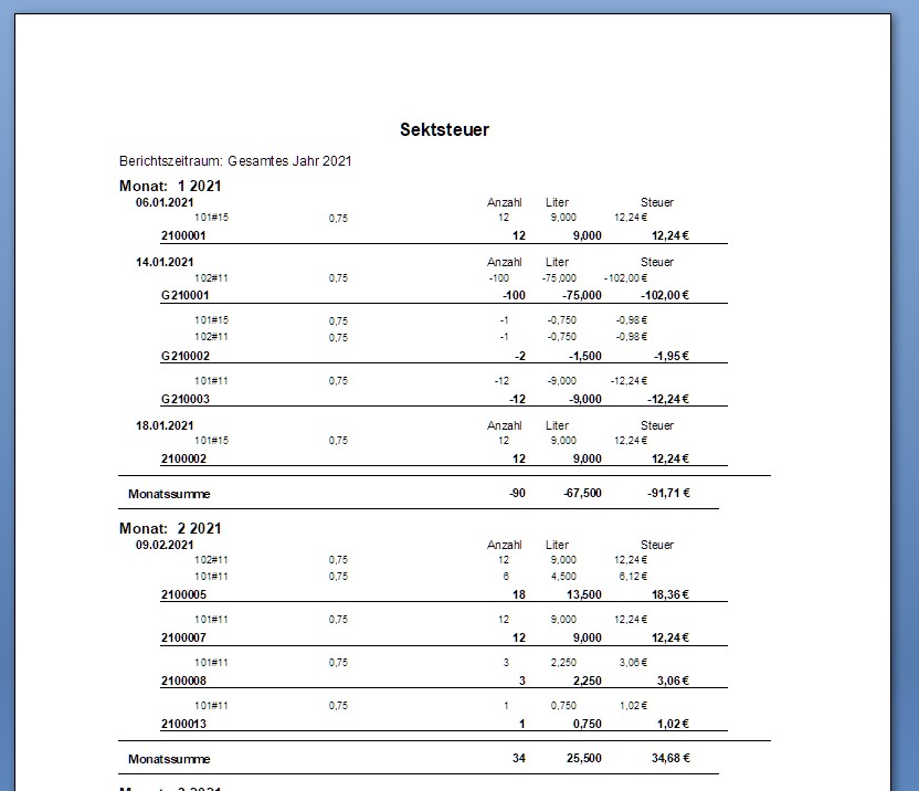 Es wird für jede Rechnung in der Sekt enthalten ist, aufgeschlüsselt wie viel Sektsteuer zu zahlen ist.