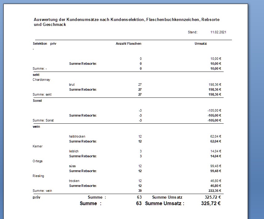 Auswertung der Kundenumsätze nach Kundenselektion, Flaschenbuchkennzeichen, Rebsorte und Geschmack.