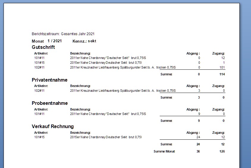 Übersicht über alle Abgänge. Also Privatentnahmen, Probeentnahme, Barverkäufe und Rechnungen.