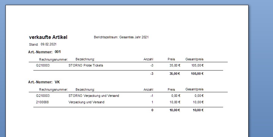 Es wird eine Übersicht über alle verkauften Artikel (alles was nicht im Flaschenbuch ist) erstellt.
