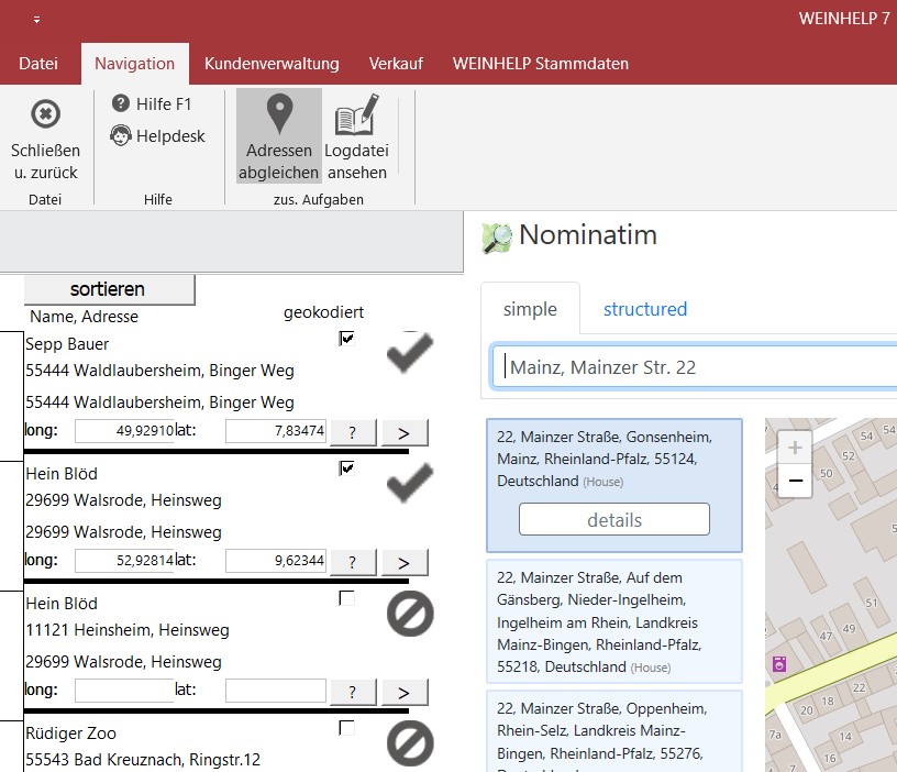 Um mit dem Adressabgleich fortzufahren, können Sie jederzeit wieder in dieses Formular zurückkehren. WEINHELP macht dann mit den noch nicht gefundenen Adressen weiter.
