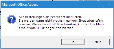 Antworten Sie mit Ja, werden die Bestellungen im Shop markiert, und die Kunden bekommen eine mail, das Ihre Bestellung bearbeitet wird. Antworten Sie mit Nein, wird nichts markiert und sie können die Bestellungen erneut abrufen. In der Regel antworten Sie mit Ja.