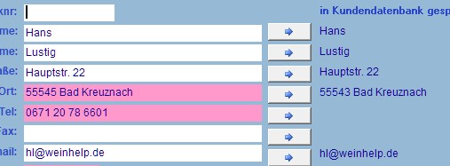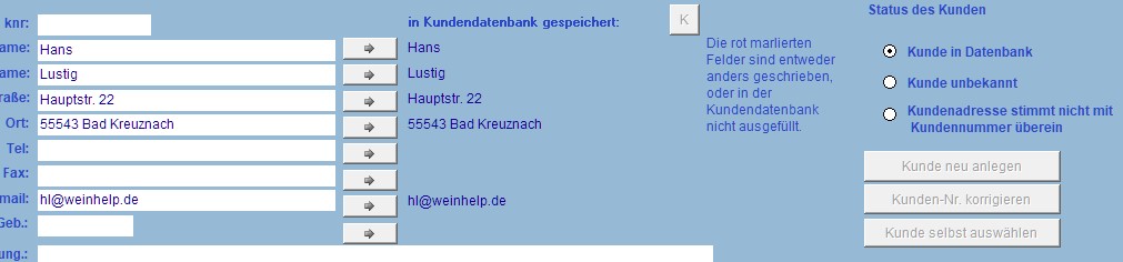 Falls WEINHELP den Kunden erkennt, aber einige Angaben anders geschrieben sind, als in der Kundenkartei gespeichert, wird der Datenbankinhalt rechts neben den eingelesenen Daten angezeigt.
