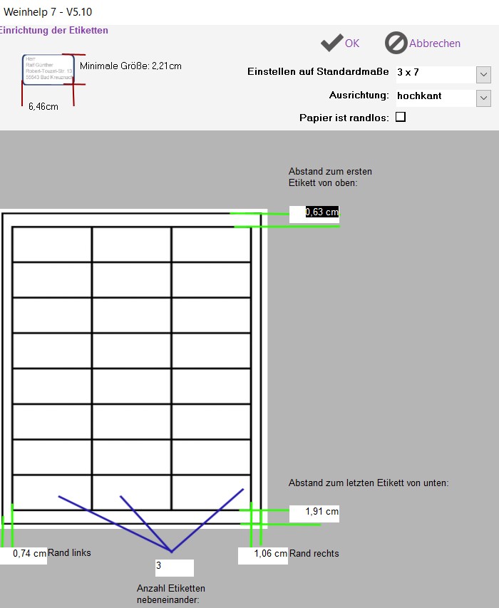 Wählen Sie bei Einstellen auf Standardmass einfach aus, wie viele Etiketten auf IhremPapier vorhanden sind. Den Rest macht WEINHELP7.