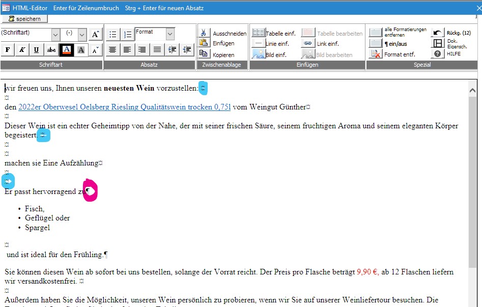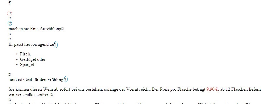 die rot markierten Zeichen zeigen einen Zeilenvorschub und die blau markierten eine Absatzende