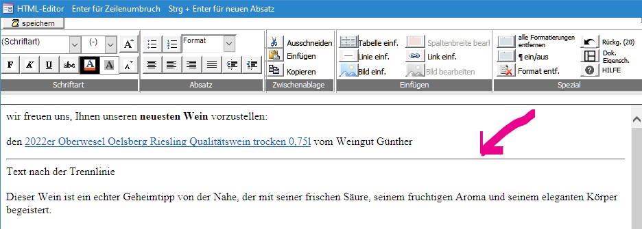 Um eine Trennlinie einzufügen, setzen Sie den Cursor an die Stelle, wo die Trennlinie eingefügt werden soll. Dann klicken Sie oben auf Linie einf. Die Trennlinie wird über die gesamte Breite eingefügt.