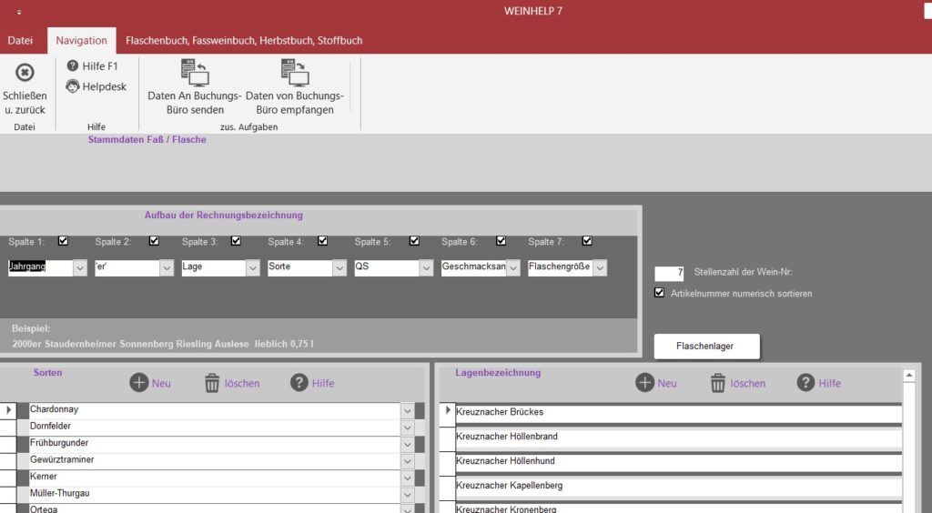 Erfassen Sie auch den / die Ortsnamen die Großlagenbezeichnung (Leitgemeinde) sowie den für Ihren Betrieb maßgebenden Bereich um allen Möglichkeiten gewappnet zu sein. Sollte Ihnen jedoch bei der Arbeit auffallen, dass eine Lage fehlt, kommen Sie mit einem Doppelklick in der entsprechenden Listbox automatisch in die Liste der Lagenbezeichnungen.