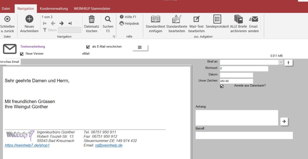 Wenn Sie als E-mail verschicken ausgewählt haben, zeigt WEINHELP links die Vorschau für die fertige E-mail an.