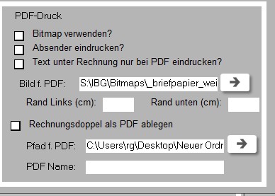 Wenn sie normalerweise kein Hintergrundbild für ihre Rechnungen benötigen, da Sie ihre Rechnungen auf vorgedrucktes Papier drücken, benötigen sie für den PDF Druck eine Grafikdatei in der das Hintergrundbild gespeichert ist. Eine solche Datei können wir gerne für Sie erstellen. Das kostet einmalig ca 65 Euro.