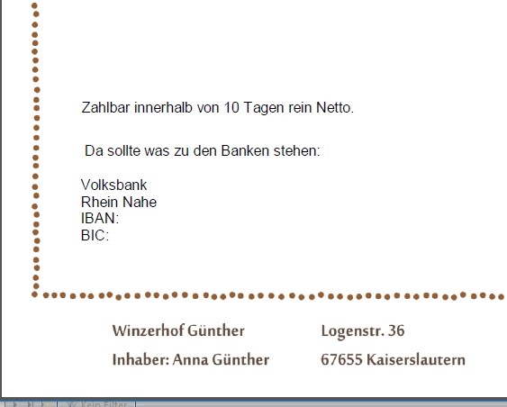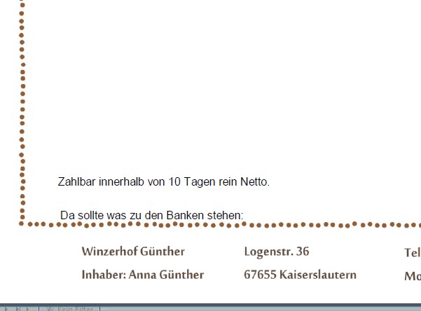 Wenn Sie einen Text unter Rechnung in den Stammdaten eingestellt haben, und dieser auch auf dem PDF mit ausgegeben werden soll, kann es sein, das der Text abgeschnitten oder gar nicht zu sehen ist