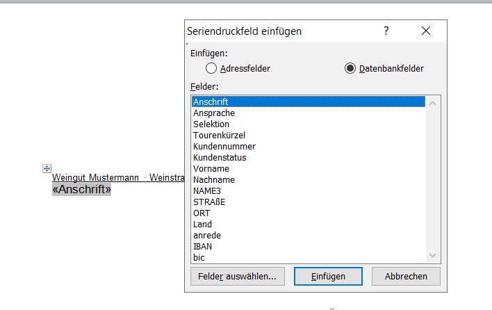 Danach können Sie dann die Seriendruckfelder die Sie benötigen in die Vorlage einfugen