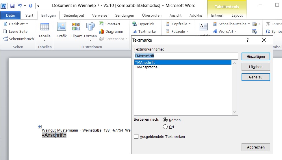 Damit die Vorlage auch als Einzelanschreiben funktioniert, müssen Sie noch 2 Textmarken einfügen.