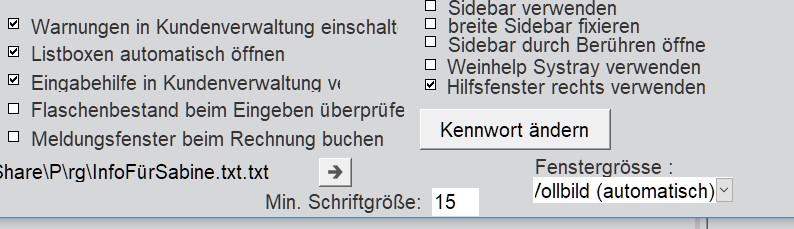- Die Schriftgrösse können Sie auch in Grenzen anpassen. Wenn Sie Probleme mit den Augen haben, können Sie hier eine Zahl zw. 11 und 15 versuchen. Bei 15 ist die Schrift schon sehr gross und es können nicht mehr alle Werte richtig angezeigt werden. Wenn Sie ene 0 eingeben, macht Weinhelp die Standardgrösse für die Schrift.