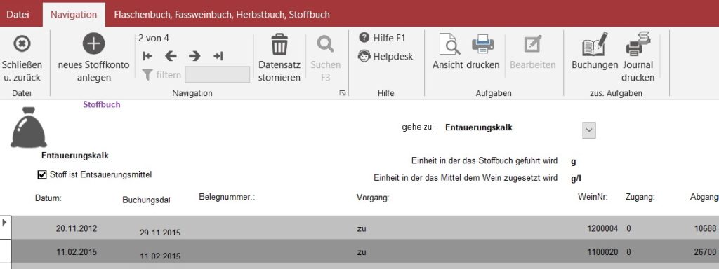 Im Stoffbuch selbst können Sie die jeweiligen Abgänge und Zugänge der in Ihrem Betrieb eingesetzten Weinbehandlungsstoffe ersehen.