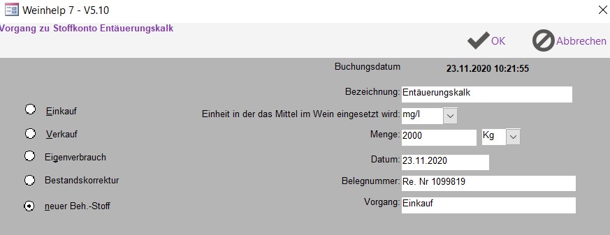 Legen Sie im Stoffbuch Ihren Entsäuerungskalk z. B. wie folgt an: